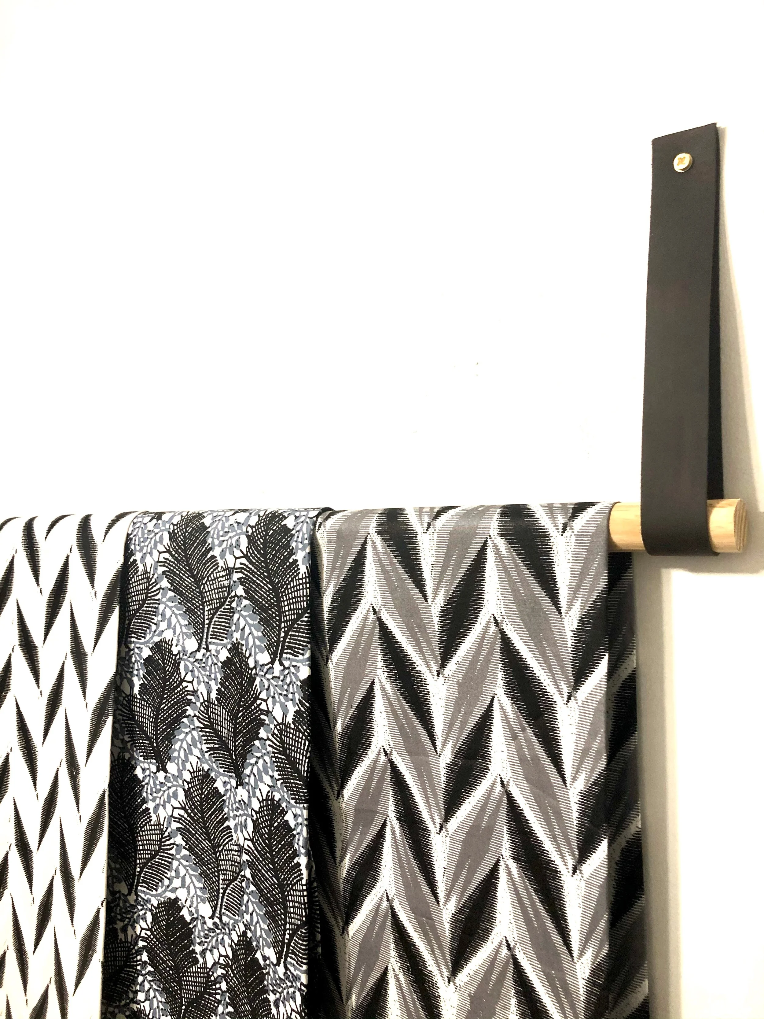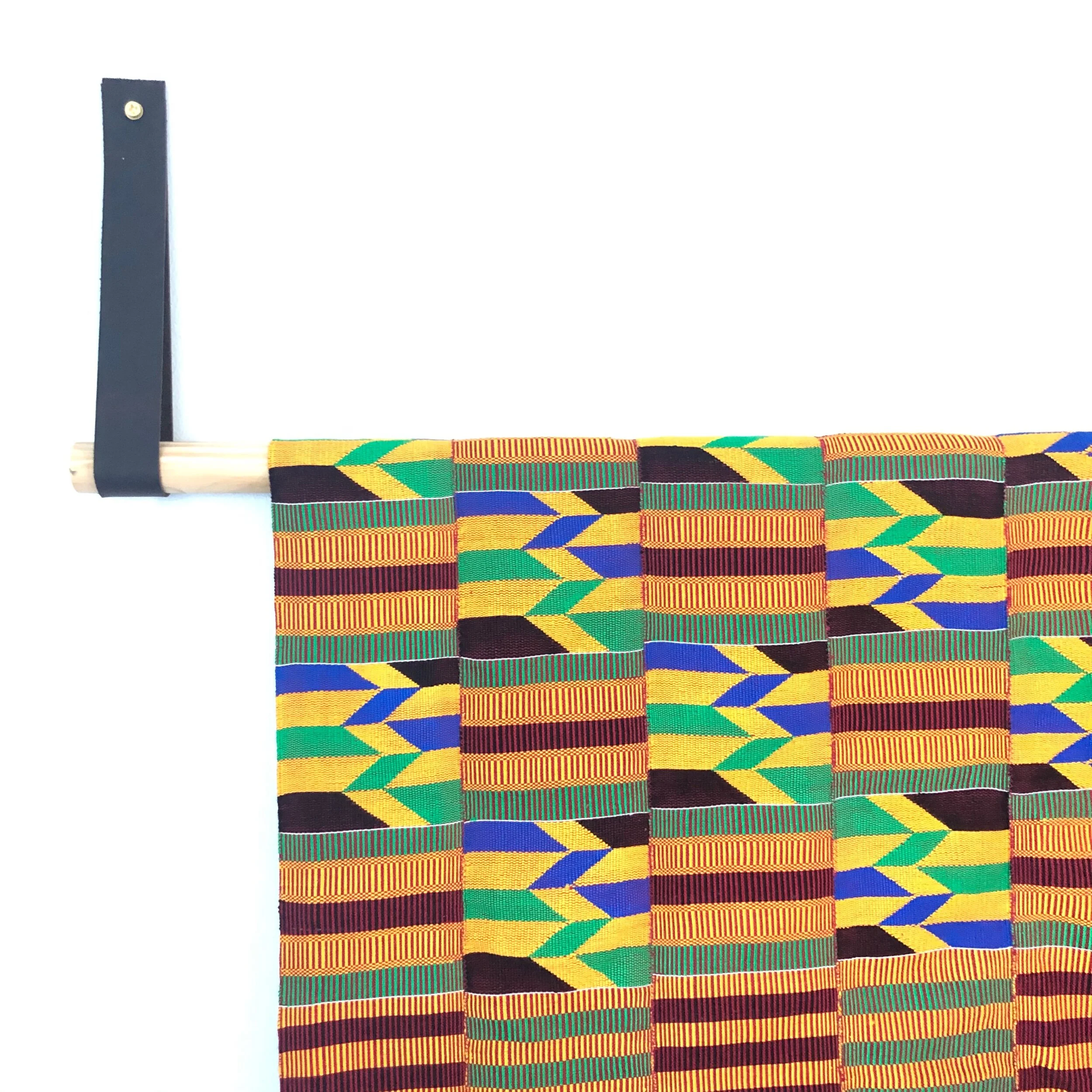 Handwoven Kente Cloth sourced from Bonwire, located in Ghana’s Ashanti Region. The dowel is sturdy enough to hang heavy fabrics like this!