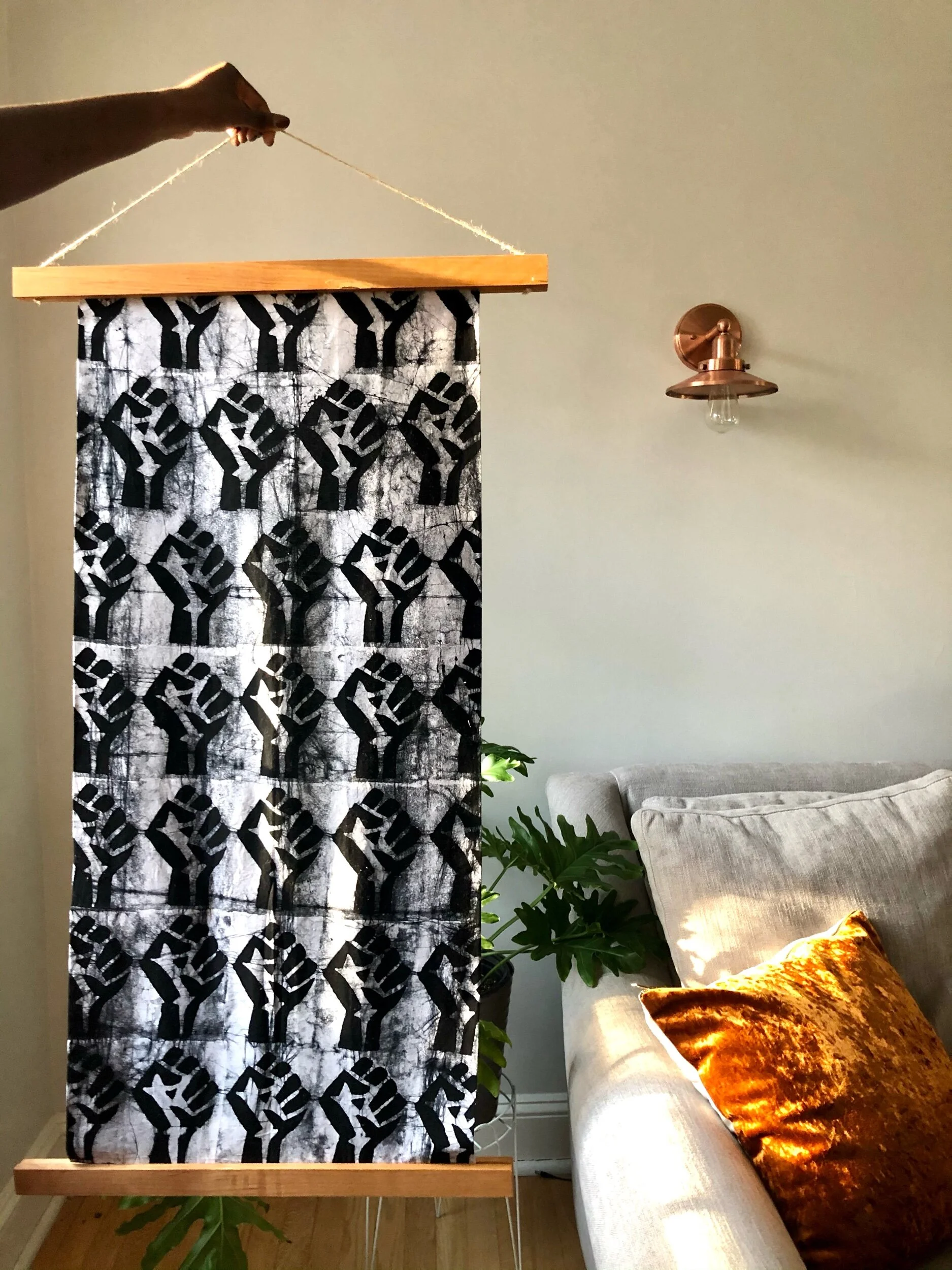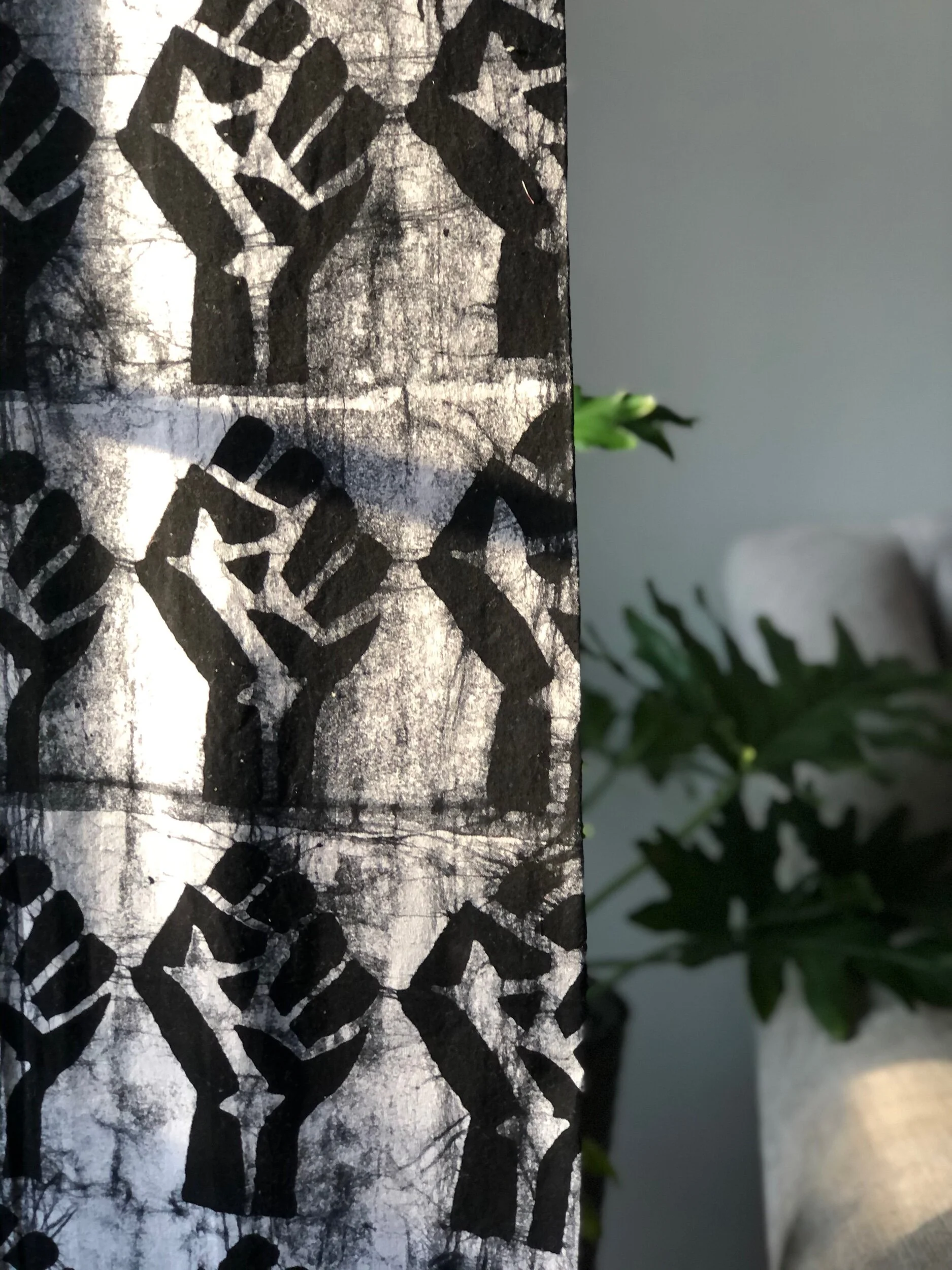 We love this print because it signifies Black solidarity. It was handmade in Ghana using the traditional batik method, which involves creating a pattern block out of a sponge, and then adding wax throughout the fabric which resists the black dye.