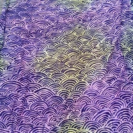 Onyinye used the batik method to create this print. Batik involves making a stamp out of a design and then stamping the design onto fabric using hot wax. The wax resists the dye and therefore creates shape we see.