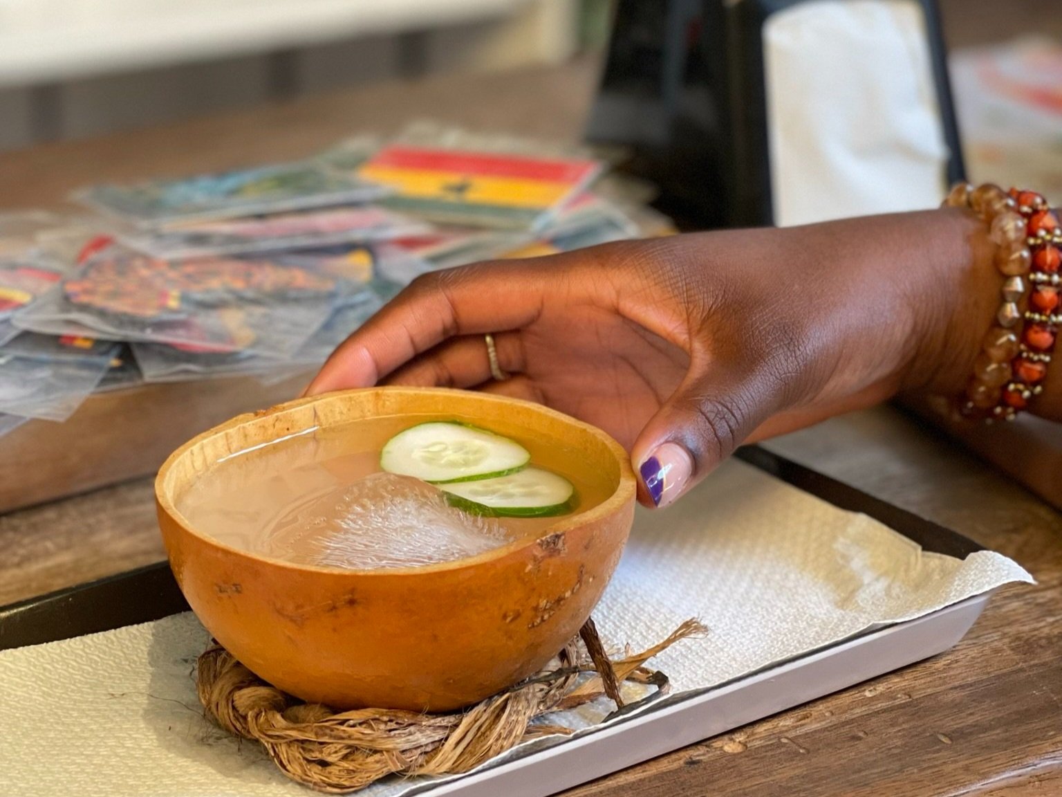 The shop offers a restaurant/bar featuring locally made food and drinks, like this palm wine.